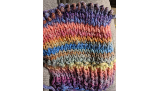 Ich wollte sie haben! Aber ich wollte nicht stricken! Also habe ich tatsächlich (dafür kann ich mir heute nur noch an den Kopf fassen) versucht die Jake nachzuHÄKELN. Erst mit dem sog. Knit Stitch, dann mit tunesischem Häkeln. Das ganze lief nicht sonderlich erfolgreich. Irgendwann habe ich dann aufgegeben, habe mir Stricknadeln und Wollte gekauft und angefangen zu stricken. Und ich habe es gehasst. Das Maschen anschlagen hat eine halbe Stunde gedauert und ich war furchtbar genervt davon, wie das Strickbild aussah: Auch mit der richtigen Wolle liefs dann nicht unbedingt besser, geübte Stricker*innen sehen sofort, wie ausbaufähig meine Technik vor allem am Bündchen ist: