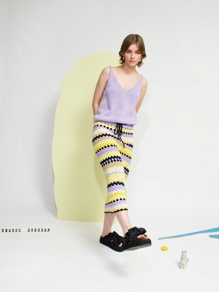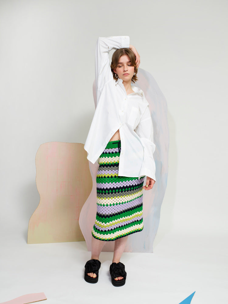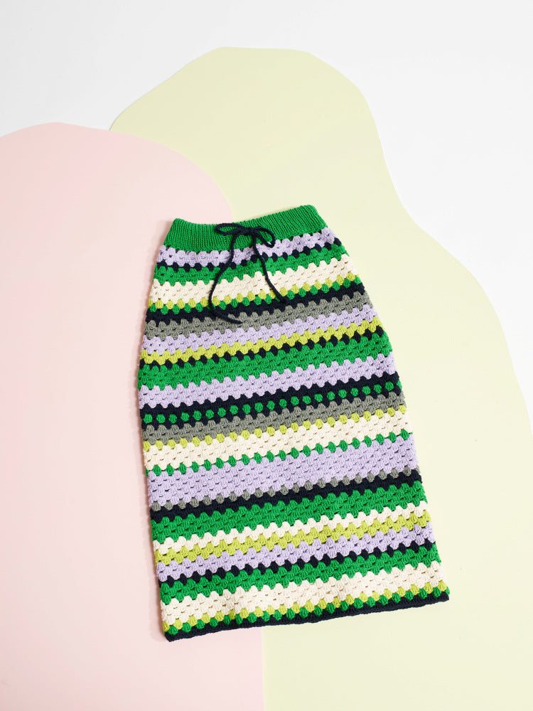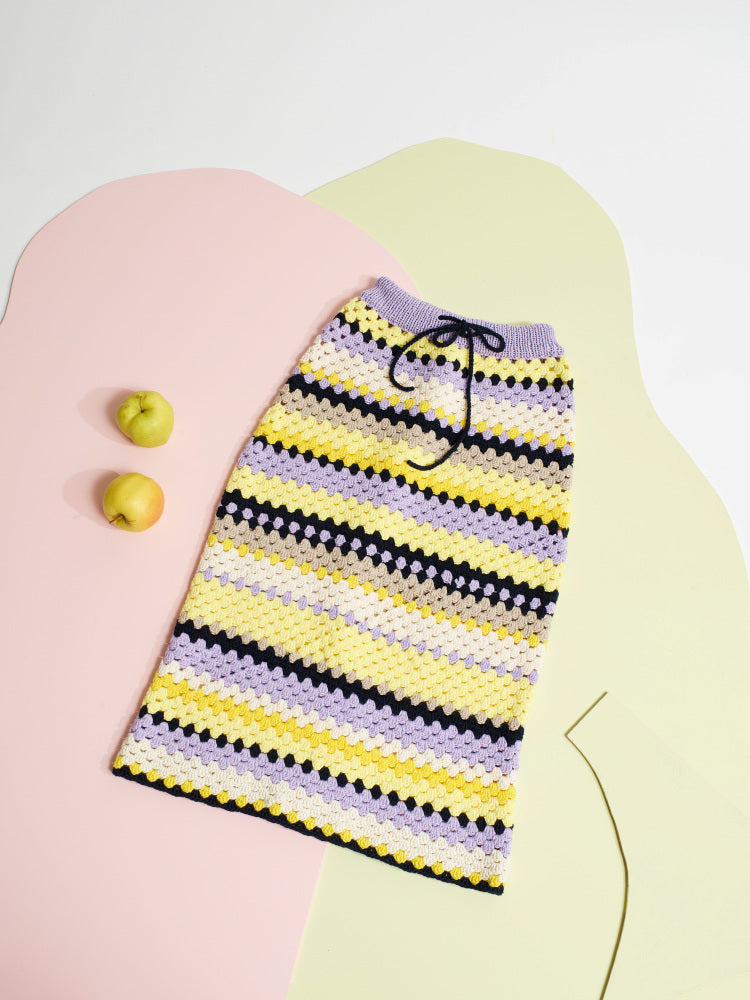 Der Krokus-Rock ist ein gehäkelter, gestreifter Rock mit gestricktem Bund und Bindeband in der Taille. Der Rock ist körpernah und gerade geschnitten und reicht etwa bis zur Mitte der Wade. Der Rock wird von oben nach unten gestrickt und ist oberhalb der Hüfte auf jeder Seite erhöht. Da der Rock von oben gehäkelt wird, kann die Länge während der Arbeit leicht angepasst werden. Für eine körpernahe Form wählen Sie eine Größe, deren Hüftbreite gleich groß ist oder ein paar cm größer als Ihre eigene Hüftbreite.
