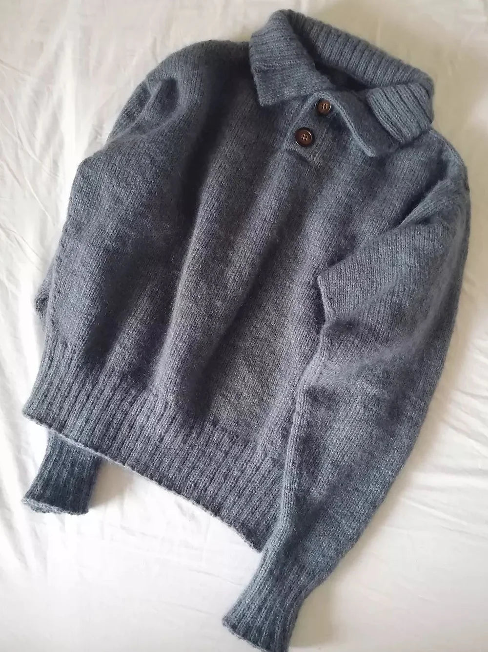 Der Whiskygrandpajumper ist ein klassischer unisex Sweater und wird oversized getragen, durch seitliche Abnahmen wird er zum Saum hin enger, wodurch eine leichte V-Silhouette entsteht. Er wird nahtlos von oben nach unten gestrickt und es gibt zwei unterschiedliche Längenstaffelungen, das kurze Modell wird für Frauen empfohlen, das lange Modell für Männer. Außerdem besteht die Möglichkeit die Knopfleiste nach individuellen Wünschen zu gestalten, es können zum Beispiel Druckknöpfe angenäht werden, das Einarbeiten von Knopflöchern für richtige Knöpfe wird alternativ ebenfalls beschrieben. Die Anzahl und Platzierung der Knöpfe kann ebenfalls individuell verändert werden.