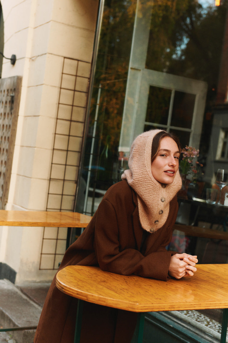 Die Kapuze wird von unten nach oben gearbeitet. Zuerst wird die Hinterseite gestrickt und anschließend die beiden Vorderteile. Danach werden alle drei Teile zusammengefügt und bis zum oberen Kopf weitergestrickt. Oben am Kopf wird ein flacher Abschnitt gearbeitet, bei dem die Mitte der Arbeit mit den beiden Seiten zusammengestrickt wird. Zum Schluss wird eine Vorderkante im Doppelstrick entlang der Vorderteile und um die Gesichtskante herum gearbeitet, und auf einer Seite werden Knopflöcher eingearbeitet.