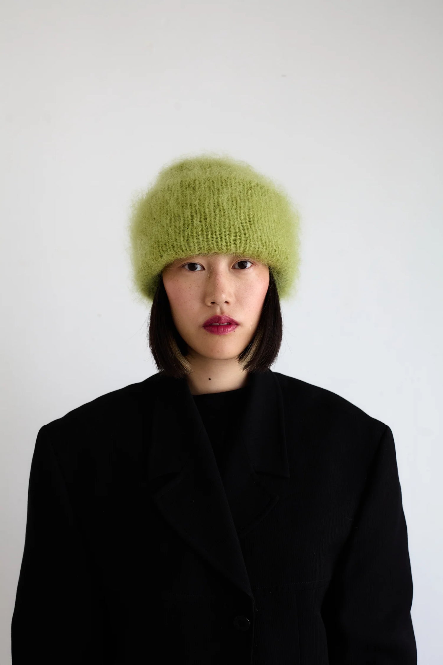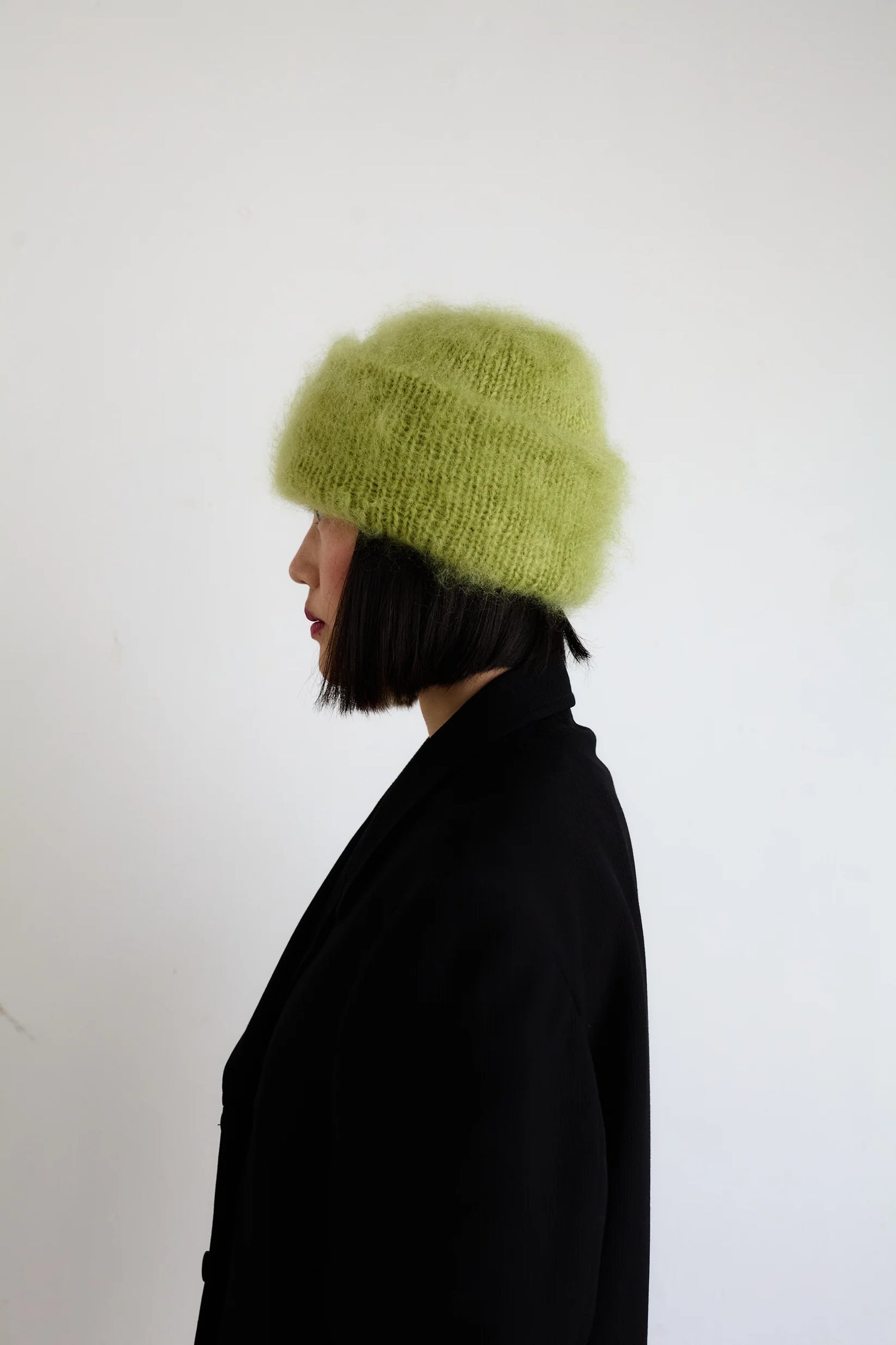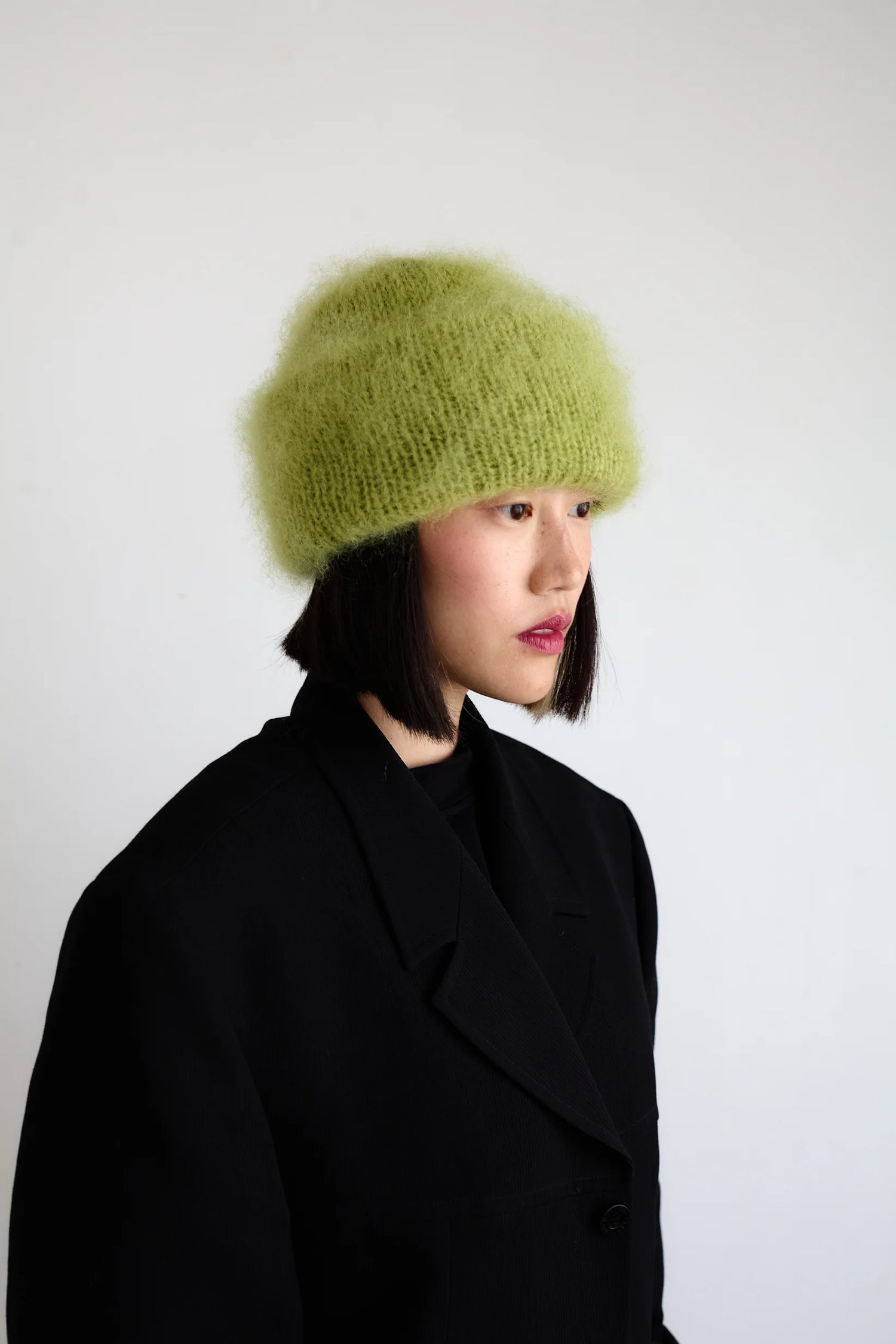 The hat is knitted in a long-haired mohair yarn that as a last touch is brushed with a mohair brush so that the fibres become long and fur-like.